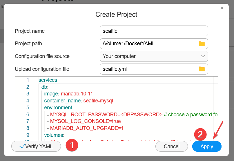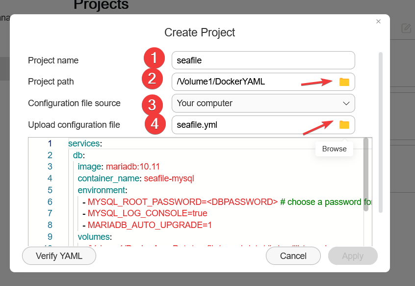 - On the Project path type /Volume1/DockerYAML or use the Browse button to navigate and select the DockerAppsData folder